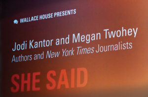 The movie chronicles the reporting of New York Times journalists Jodi Kantor and Megan Twohey, credited with successfully revealing decades of sexual misconduct by film producer Harvey Weinstein and igniting the #MeToo movement. When the film ended and the two reporters walked onto the stage, the packed audience stood for an extended standing ovation and students lined up in the the aisles to ask questions.